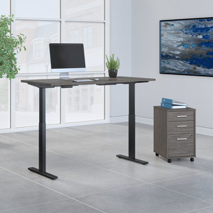 Save space, get organized and work comfortably in your home office with this 2 Piece L-Shaped Desk Office Suite. The desktop holds up to 20 pounds when at the standing height so you can bring materials with you when you need to stretch your legs. Spacious bookcase shelves adjust to fit items of varying sizes to keep everything you need within reach. The convenient corner desk design gives you the work space and storage you need without taking up too much room. For those who need even more... Chair Included: No Bookcase Included: Yes Overall Product Weight: 164 lb. Assembly Required: Yes Product Warranty: 1 Year
